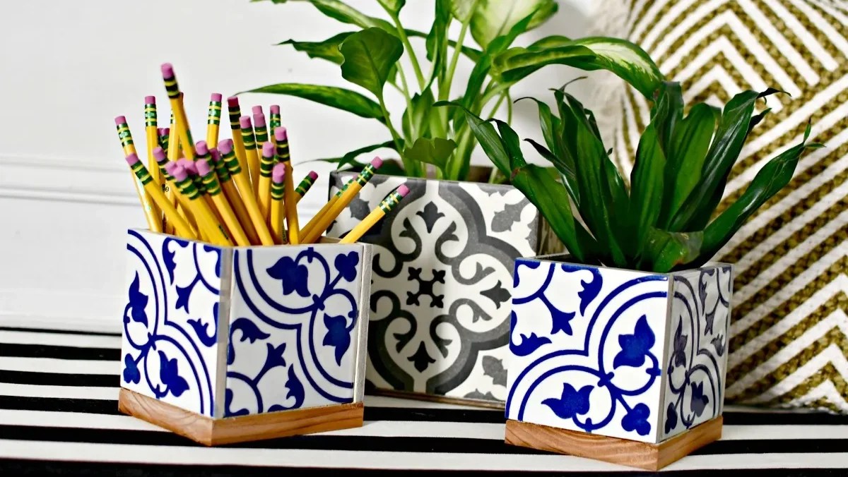 How to Do It: Simply glue the tiles or stickers onto the outside of your containers. Choose blue and white patterns for a classy look, or go with gray marble-style tiles for something modern and sleek.